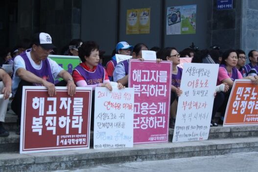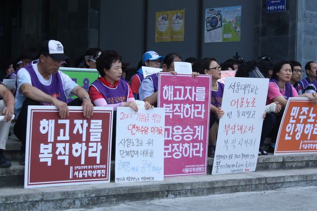 오늘(27일) 11시 40분 서울일반노조 서울대분회가 본부 앞에서 부당해고자 복직을 위한 집회를 열었다.100여 명이 참여한 가운데 전국 노점상 연합회, 일반노조 관악구 지구, 건설노조 관악지회, 관악 주민연대, 관악구 지역정책연구소 ‘오늘’ 등의 단체가 연대했다.이들은 크게 ▲부당 해고자 원직복직 ▲성추행 가해자 추방 ▲노동 조건 점검 및 개선을 요구했다.