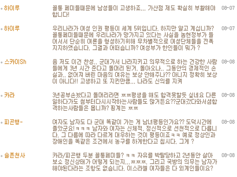 | 포털사이트 다음의 ‘아고라’ 게시판에 달린 댓글들. 군가산점제를 둘러싸고 양성 간에 오가는 비난성 댓글로 가득하다. |