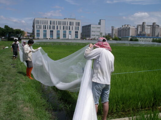 논을 가르고 드넓은 지역에 방조망을 치는 일은 제법 힘들다. 문강현(식물생산 석사과정) 씨는 “사실 이런 작업을 돈 주고 외주를 줘도 되지만, 직접 만든 재료들로 실험해야 정확한 데이터를 구할 수 있기 때문에 이런 수고를 감수한다”라며 더운 날씨에도 꿋꿋이 작업을 한다.
