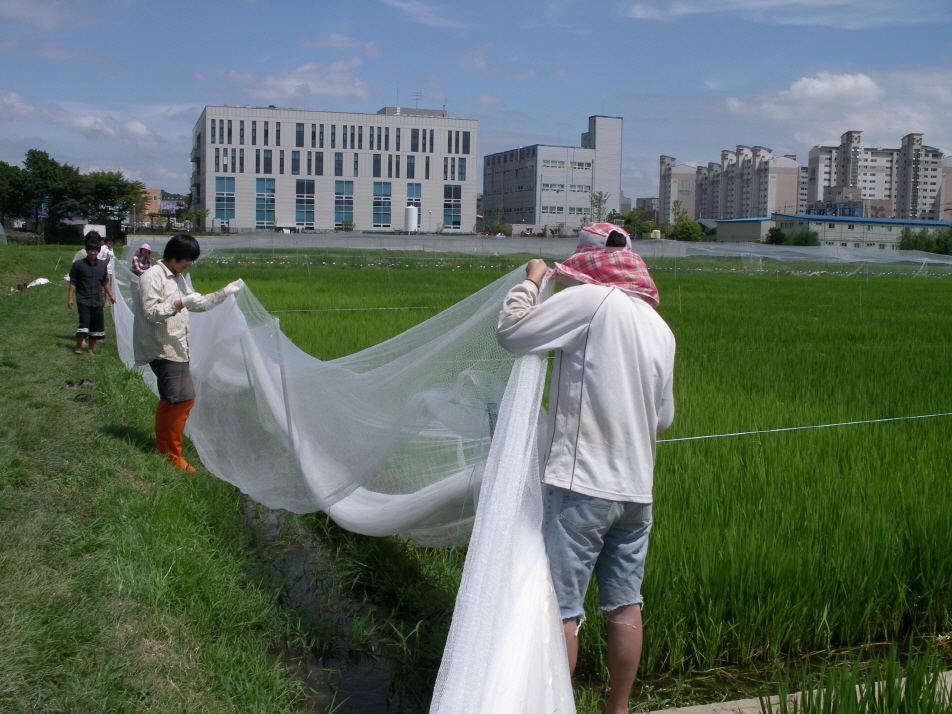 오늘은 실험용 논에 방조망 치는 날. 아침부터 수원에 내려온 대학원생들과 학부생들이 방조망 칠 준비를 하고 있다.