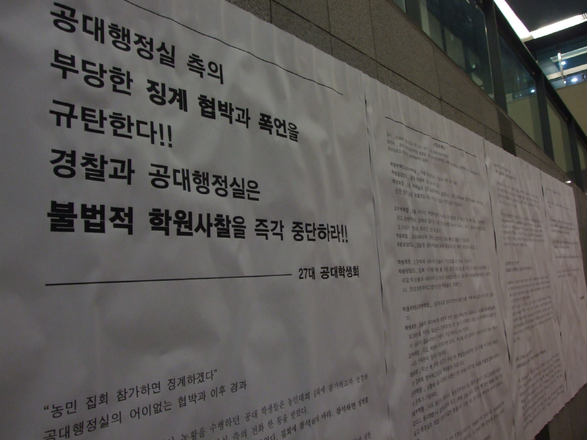 (저널) 7월 어느 날, 중앙도서관 터널에 자보 하나가 붙었다.“공대 행정실의 징계 협박 폭언을 규탄한다”는 내용이었다.자보를 붙인 공대학생회 측에 따르면, 지난 6월 농활을 떠났던 학생 중 일부가 여의도에서 열리는 농민집회에 참가하려 중간에 상경했다.하지만 공대 행정실이 이 사실을 경찰로부터 전달받고는 당시 상경 중이던 4명의 학생을 학교로 불러서 농민집회에 참여하지 못하게 협박하고 회유했다는 것이다.