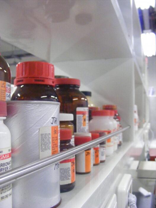 | 폐수 발생 실험실 500여 개 중 50%는 실험실 내부에 배치, 28%는 후드 안에 보관하고 있다. 사진은 후드 안에서 유기계 폐액통을 보관하고 있는 모습. |