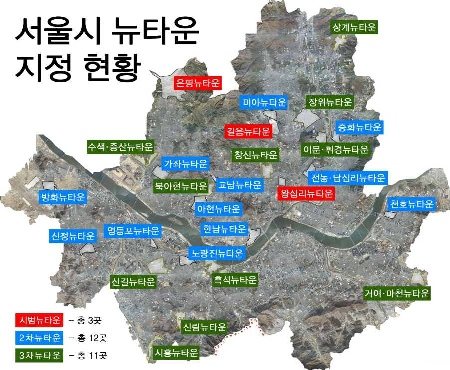 이명박 전 서울시장 임기 중 3차까지 지정된 뉴타운 현황. 그림에 표시되지 않은 촉진지역까지 합하면 모두 35곳에 달한다.