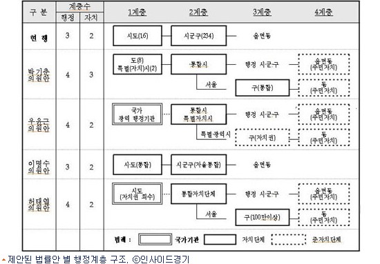 지방행정체제 개편이란 현재 2단으로 구성된 16개 시·도, 234개의 시·군·구 자치단체 계층을 전면적으로 수정하는 것을 말한다. 현재 국회에 발의된 6건의 법안 가운데 지방행정체제개편특별위원회의 위원장을 맡고 있는 허태열 의원(한나라당)의 발의안이 가장 유력한 것으로 평가받고 있다. 이 법안에 따르면 현재의 시·군·구를 60에서 70여 개로 통합하고, 도를 폐지하는 대신 사회간접자본 설치 등 일반 시·군·구에서 해결하기 어려운 일을 처리하는 국가기관을 만드는 것을 골자로 하고 있다. 하지만 이 법안은 각계각층에서 비난을 받고 있다. 중앙대학교 이규환 교수(행정학과)는 “어떠한 나라도 중앙정부가 지방정부를 단층으로 구성해 직접적으로 통제하는 곳은 없다”며 “지방자치제는 물거품이 되고 중앙집권화가 가속화 될 것”이라고 경고했다.