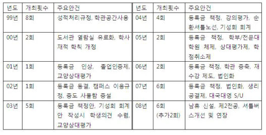 교개협이 처음 개최된 때는 1999년 6월 25일이다. 이후 공식적으로 총 39차례의 교개협이 개최됐다. 교개협은 교육환경 전반에 대해 교수와 학생간 의견 교환 및 논의를 위해 만들어졌다. 학생회관 공간 문제, 캠퍼스 이용 규정 등 학생 복지에 관한 내용뿐만 아니라 등록금 책정, 기성회 회계안, 법인화, 학부대학 전환 등 학내의 굵직한 사안들도 교개협을 거쳐갔다. 한마디로 교육환경에 대한 전반적인 사안들이 교개협의 논의 대상이 되는 것이다. 사안별로는 등록금 책정이 가장 많이 논의됐다. 2001년 9월 24일, 11차 교개협에서 처음 논의된 이래, 12차~14차, 18차~19차, 22차, 24차, 27차~28차, 33차~34차 등 총 11번의 교개협에서 등록금 문제가 논의됐다. 특히 등록금 문제는 교육투쟁특별위원회(교투특위)가 발족돼 위원장이 교개협에 참석하기도 했다. 교개협은 사안에 따라 총학뿐만 아니라, 단과대 학생회장, 교투특위 위원장 등이 배석한다. 본부 측에서는 학생처장과 교무처장 등이 배석하며 사안에 따라 본부 각과 직원이 배석하기도 한다. 하지만, 상당수의 사안들은 총학의 공약에 관한 것들이었다. 2007년의 경우, 50대 총학의 공약이었던 생리공결제, 대학국어와 대학영어 학점 평가를 S/U로 변경하는 문제, 여학생 전용 체육수업 개설 등이 논의됐다. 2008년도 에는 51대 총학의 셔틀버스 관련 사안, 남학생 휴게실 신설 등의 문제가 논의됐다. 최근들어 등록금, 법인화 등 비교적 큰 사안들은 줄어드는 경향이다. 반면 학생들의 복지 차원의 사안이 눈에 띄게 늘었다. 특히 51대 ‘실천가능’ 총학이 들어선 이후, 그런 경향이 늘었다는 평이다. 학생과 권오황 학생주임은 “과거 운동권 총학의 경우 정치적인 사안들을 제시했지만 비운동권 총학이 들어선 지금은 복지적인 측면에 관한 논의가 늘어났다”고 설명했다. 교개협의 학생 측 주체가 총학이기 때문에 총학의 성격에 따라 사안들이 달라질 수도 있다는 것이다. 특히 ‘실천가능’이 복지 공약을 주로 내세우면서 교개협에 상정되는 사안들의 성격도 복지 쪽으로 기울었다.52대 총학과 교개협 52대 총학이 내세운 복지 공약 사항의 상당 부분도 교개협을 통해 논의됐다. 38차 교개협에서는 ▲군 복무 중 학점이수제도 ▲외국인학생 21학점 수강 제한 완화 ▲S/U 학점 신청제 ▲중앙전산원(중전) 24시간 개방 ▲낙성대 셔틀버스 재운행 ▲중앙도서관 사물함 증설 등이 논의됐다. 군 복무 중 학점이수제도와 외국인학생 21학점 수강 제한 완화, S/U 학점 신청제, 중전 24시간 개방을 제외한 나머지는 해결됐거나 해결 중인 사안들이다. 38차 교개협에서는 군 복무 중 학점이수제도 등에 관한 소위원회 개설이 결정됐다. 하지만 소위원회는 38차 교개협으로부터 2개월 가량 지난 5월 14일에서야 구성됐다. 5월 1일, 교개협과 관련된 실무회의가 있기 전까지도 개최되지 않았던 것이다. 이에 대해 총학생회장 박진혁(경제 05) 씨는 “본부와 총학이 생각한 소위원회의 상이 달랐던 것 같다”고 해명했다. 박진혁 씨는 “학사관련 문제는 보직 교수와 논의가 돼야 하는데, 본부는 실무자들과 논의를 하는 것으로 생각한 것 같다”고 설명했다.