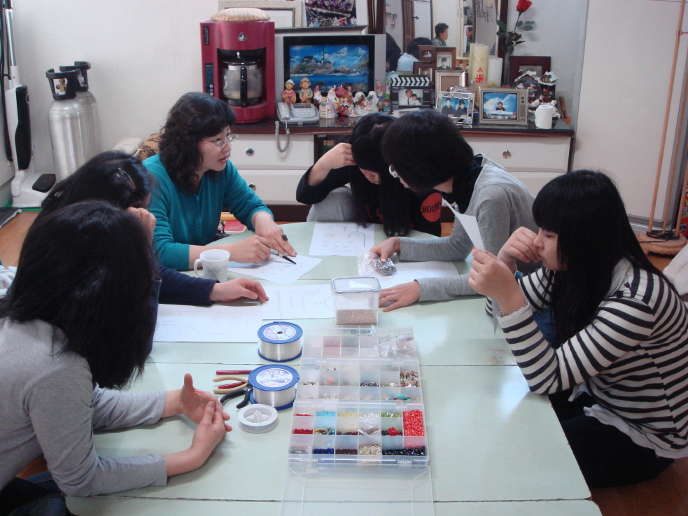 선생님에게서 비즈 공예에 대한 설명을 듣고 있는 고양쉼터 아이들.