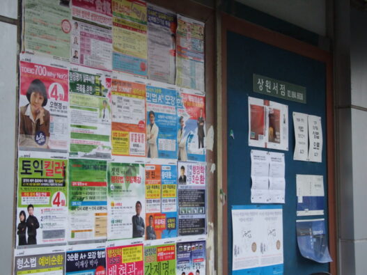 | 신림동 고시촌 주변 서점에 붙어있는 학원 전단지들. |