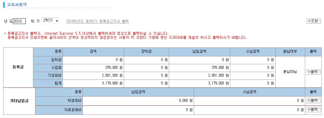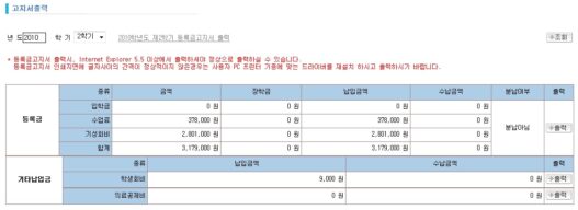 | 학생회비를 ‘기타 납입금’으로 표시한 2010년도 2학기 등록금 고지서. 납부 방식이 변경되면 학생회비는 등록금에 포함된다. |