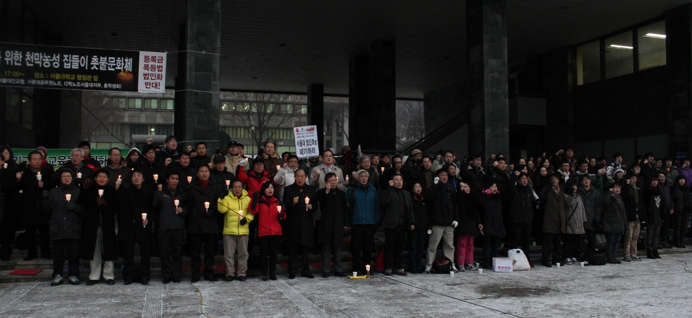 지난해 12월 ‘서울대법인화법 폐기를 위한 천막농성 집들이 촛불문화제’에는 공무원노조, 야당 등 다양한 인사가 참여했다. 정작 학생 사회의 입장은 충분히 모이지 못한 상태다. ⓒ서울대저널 자료사진