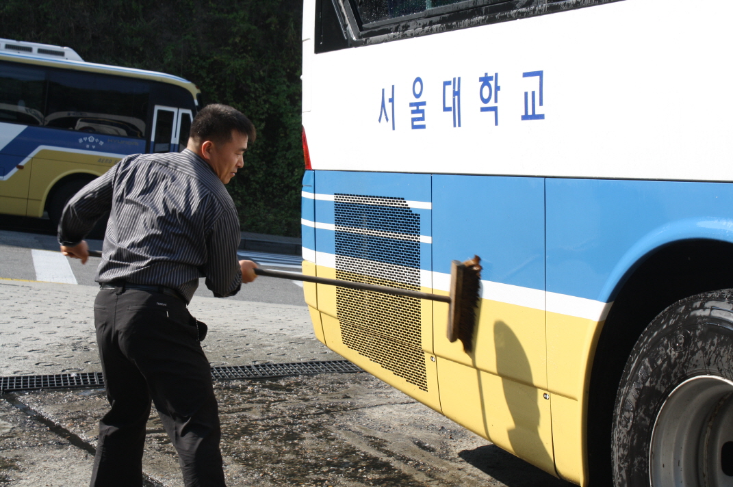 | 방근호 부반장이 셔틀버스 세차를 하고 있다. 그는 “버스기사가 지나친 업무에 시달린다”며 처지가 개선되기를 희망했다. |