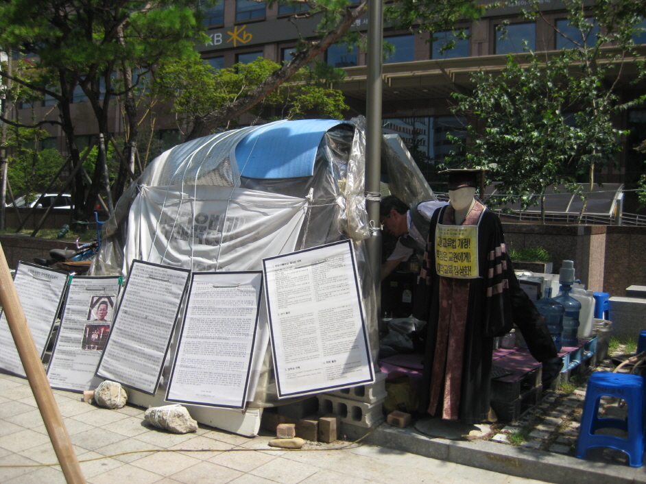 지난 5월 25일, 조선대에서 10여 년째 영문학을 강의하던 서정민 강사가 스스로 목숨을 끊었다. 3월 27일에는 건국대에서 강의를 하던 한경선 강사가 모교인 텍사스 주립대에서 스스로 생을 마감했다. 서울대에서만도 지난 2003년 이후 3명의 시간강사가 극단적인 선택을 했다. ‘학생을 가르치는 사람’이지만 ‘교원’의 지위를 인정받지 못해 대학을 떠돌아다니는 시간강사들. 하지만 그들의 잇따른 죽음 이후에도 시간강사의 처우에는 전혀 달라진 것이 없다. 시간강사 교원 지위 회복을 위해 국회 앞에서 벌어지고 있는 천막농성도 어느덧 1093일째다. (2010년 9월 3일 기준) 농성중인 ‘한국비정규교수노동조합 고려대분회장’ 김영곤 씨와 ‘대학강사 교원지위 회복과 대학교육 정상화 투쟁본부’ 본부장 김동애 씨는 “오늘이 1068일째 되는 날이네요”라며 기자가 투쟁현장을 찾은 그 날도 투쟁이 몇 일째인지를 정확하게 기억하고 있었다. 국회 앞 천막농성 1000여 일째, 이제는 일상 김영곤 씨와 김동애 씨 부부는 매일 아침을 국회 앞 천막농성장에서 시작한다. 2007년 9월 7일부터 꾸준히 해 온 일과다. 2006년 8월 한국비정규교수노동조합 산하 교원법적지위쟁취특별위원회가 발족했고, 김동애 씨가 위원장을 맡으면서 1년간 직접 1인 시위를 했다. 2007년 들어 위원회 차원에서 천막농성을 시작하게 됐다. 각각 고려대(세종캠퍼스), 한성대의 시간강사였던 부부는 가장 기본적으로 시간강사에게 교원 지위가 부여돼야 한다고 주장한다. 그래야만 시간강사들에게도 낮은 시급 대신 현실화된 연봉이 주어지고, 4대 보험이 적용되며, 말 그대로 최소한의 ‘기본적인’ 생활이 가능하기 때문이다.