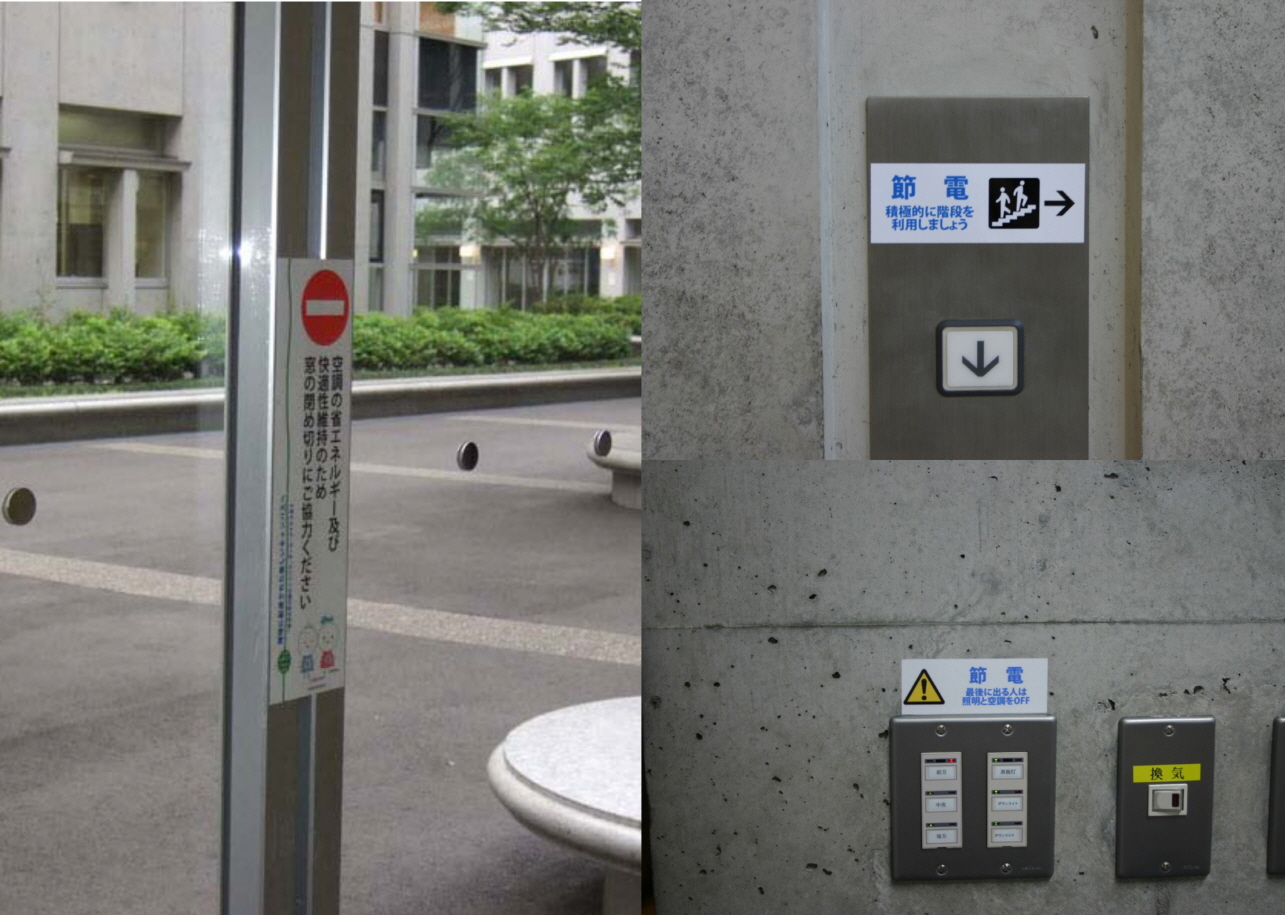 | (1-2면 바탕사진. 이 위에 워터마크 박스 처리해 본문 얹음) 토요대학 카와고에 캠퍼스 곳곳에 붙었던 에너지 절약 홍보물들. ‘문 단속을 철저히 하자’ ‘계단을 이용하자’ ‘마지막 나가는 사람이 소등하자’ 등의 내용이 담겨 있다. |