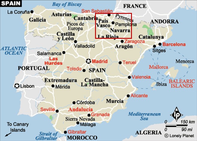 | 스페인 지도. 붉은 테두리로 표시된 지역이 바스크족의 근거지다. |