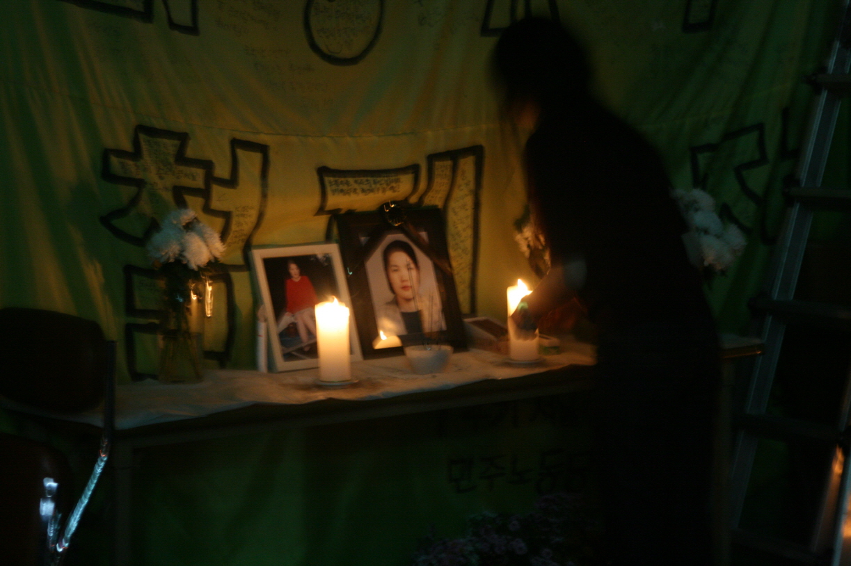 기륭전자 앞 농성장에 세워진 고 권명희 씨의 빈소.