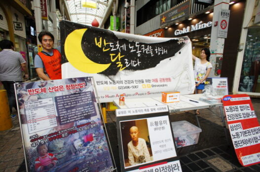 7월 23일 오후 6시 30분 대한문 앞에선 삼성반도체 기흥공장에서 엔지니어로 일하다 2005년 사망한 황민웅 씨에 대한 추모제가 있었다. 추모제 시작에 앞서 시민들에게 반올림 활동을 홍보하고 진행 중인 소송에 대해 재판장에게 보내는 탄원서를 받았다. 반올림에서는 이런 활동을 ‘선전전’이라 부르는데 이날 선전전에는 한의대, 의대, 간호대 학생들로 구성된 보건의료 학생모임 ‘매듭’의 학생들이 함께했다. 언론을 통해 삼성반도체 백혈병 문제에 대해 알고 있다는 여러 시민들이 다가와 서명했다. 민중가수 지민주 씨가 故황유미 씨 추목곡인 ‘하얀방-나를 잊지 마세요’를 부르면서 추모제가 시작됐다. 故황민웅 씨의 아내이자 삼성반도체에서 근무한 적 있는 정애정 씨는 전날 편지를 준비해달란 말에 컴퓨터 앞에 2시간 넘게 앉아만 있다가 완성하지 못했다면서 준비한 편지를 읽었다.