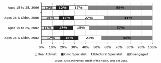 조사 문항 중 1~5번에 해당하는 문항은 시민활동 지표를, 6~10번에 해당하는 문항은 선거관련활동 지표를, 11~19번에 해당하는 문항은 정치적 표현활동 지표를 측정하기 위한 문항이다. ‘시민적, 정치적 건전성 조사’ (CIVIC AND POLITICAL HEALTH OF THE NATION SURVEY)에서는 시민활동 지표 중 2개 이상에 참여하는 사람을 ‘시민활동 적극참여자 (Civic Specialist)’로, 선거관련활동 지표 중 2개 이상에 참여하는 사람을 ‘선거관련활동 적극참여자 (Elecoral Specialist)’로, 시민활동 적극참여자와 선거관련활동 적극참여자 모두에 해당되는 사람을 ‘이중 참여자 (Dual Activist)’로 분류한다. 시민활동 지표와 정치적 표현활동 지표를 통틀어 2개 미만의 활동에 참여하는 사람은 ‘미 참여자 (Disengaged)’로 분류된다. 미국인들을 대상으로 한 2002년과 2006년 조사의 결과는 아래 표와 같다.