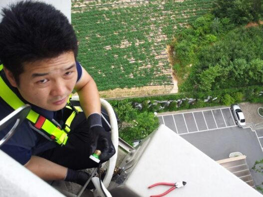 ▲삼성전자서비스 수리기사들은 안전사고에도 노출돼 있다. 사진은 삼성전자서비스 기사가 아파트 고층 난간에 매달려 에어컨을 수리하는 모습. ⓒ 삼성전자서비스지회
