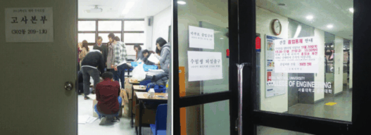 ▲ 11월 21일에 서울대학교 수시 모집 일반 전형 면접 및 구술고사가 있었다. (좌) 입시 당일 고사 본부는 아침부터 북적였다. (우) 서울대학교 공과대학은 수시 당일 학부모들의 시험장 출입을 금지했다.