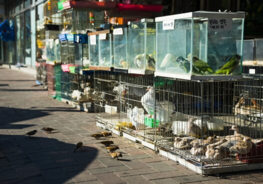 청계천 7가 사거리 옆엔 조류원이 밀집해있다. 이 중 판매업 등록이 된 업소는 한 군데도 없다. 불법으로 동물을 판매하는 상점들의 상황은 열악하다. ‘동물보호법 시행규칙’에 따르면 사육 설비의 너비는 사육하는 동물의 코부터 꼬리까지의 길이의 2배가 돼야한다. 하지만 작은 철창에 갇힌 금계의 꼬리는 사육장을 넘어 보도블록에 닿아있다. 한 새장에 비둘기 9마리가 들어있기도 하다. 동물자유연대 정진아 선임간사는 “종로구청에 수차례 개조조치를 했는데도 불구하고 아직 조치가 이뤄지지 않고 있다”고 전했다. 기온이 영하로 내려가는 겨울에도, 25도가 넘는 여름에도, 날 수 없는 새들은 길 위에서 매일을 보낸다.