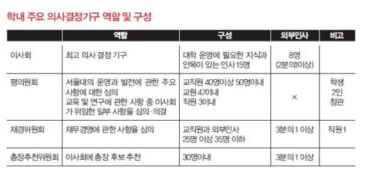 현재 서울대의 의사결정구조에서 학생들은 실질적인 의사결정 주체로 참여하지 못하고 있다. 학교 운영 전반에 대한 중요 사항을 심의·의결하는 주요 기구들인 이사회, 평의원회, 재경위원회, 총장추천위원회는 모두 법령으로 구성원을 규정하고 있는데, 현재 학생의 참여를 배제한다는 공통점이 있다. 그나마 평의원회는 학생 대표 2인의 참관을 허용하고 의장 재량으로 발언 기회도 주고 있다. 하지만 평의원회도 형식적 참관에 그친다는 지적이 있다. 전 총학생회 정책국장 정주회(서양사 10)씨는 “회의 직전 정리되지 않은 방대한 자료가 담긴 안건지를 주는데, 도저히 회의 전까지 소화할 수 없는 자료”라고 말했다.