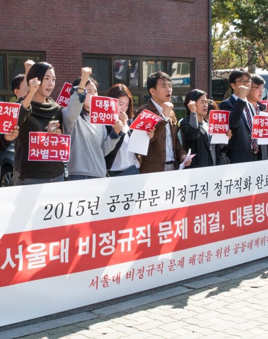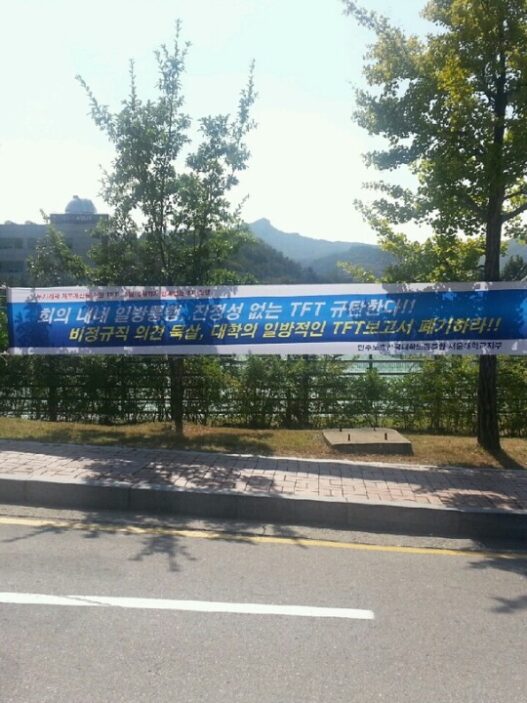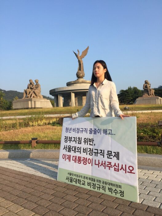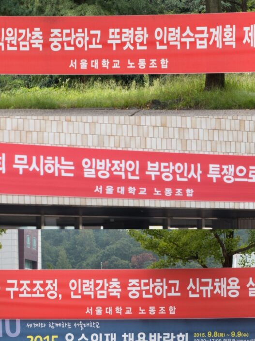 서울대는 올해 초 외부 컨설팅업체에‘ 서울대 조직 및 직무 분석 컨설팅’을 의뢰했고, 최근 그 결과를 받아 조직개편안을 마련 중이다. 그 준비 단계로 본부는 우선 일부 정규직 신규 채용을 유예하기로 했다. 서울대노조는 정규직 신규인력채용 유예 및 감소 계획에 반발해 지난 7월‘ 몸 자보’ 시위에 돌입했다. 한편 그동안 정규직 직원으로 구성된 서울대노조는 비정규직 문제에 무관심하다는 평가를 받아왔다. 본부의 변화를 이끌어내 서울대의 전반적인 근로 조건을 개선하기 위해서는 서울대노조가 보다 적극적으로 비정규직을 위한 목소리를 내며 연대하는 것이 필요해 보인다.