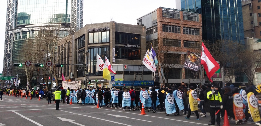 ▲ 광장에서 일본대사관까지 행진하는 3・1 한일 일본군 ‘위안부’ 합의 무효 전국행동의 날 참가자들.