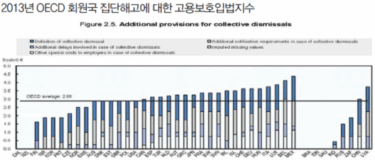 고용노동부가 연구용역을 맡기고 한국노동연구원이 연구기관으로 참여한 연구보고서 ‘경영상 이유에 의한 해고 관련 국제적 흐름’(2013년)에 의하면, 우리나라는 OECD 회원국 중 ‘집단적 정리해고가 쉬운 나라’ 3위에 올랐다. 고용노동부는 현행 정리해고 요건이 국제적 기준에 부합한다는 입장이지만, 정작 우리나라는 국제적으로 해고가 가장 쉬운 국가 중 하나로 분류된 것이다.