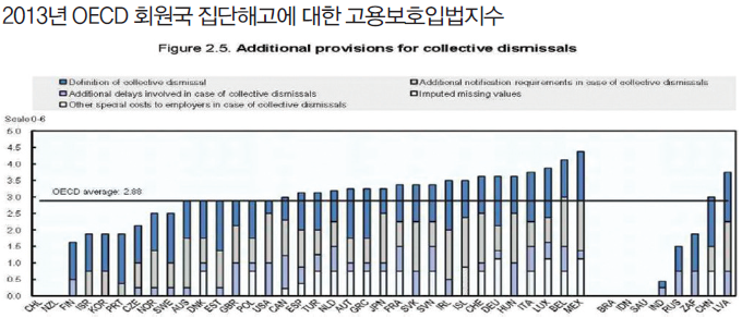 보고서에 따르면 한국의 집단해고 부문 고용보호입법지수는 1.9로 산출됐다. 이는 핀란드에 이어 두 번째로 낮고, 이스라엘·포르투갈과 비슷한 최하위 수준의 수치다. 반면 미국과 영국은 OECD 평균 수준이었으며, 일본·프랑스·독일·이탈리아 등은 집단해고 보호 제도가 비교적 잘 갖춰진 것으로 나타났다. 이 같은 한국의 고용보호입법지수는 1998년 이후 오랫동안 변화될 기미를 보이지 않고 있다. 1998년 외환위기 당시 경영상해고 제도가 도입되고, 정리해고 기업들이 주장한 ‘긴박한 경영상의 필요’를 법원이 폭넓게 인정하기 시작하면서 굳어진 결과다.