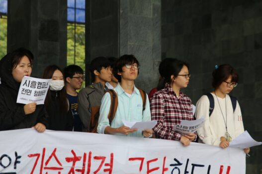 모두발언에 나선 김민석(정치 14) 부총학생회장은 “본부는 학생을 동등한 주체로 인정하고 협상에 나서야 한다”며 “요구가 관철되지 않으면 집단행동의 수위를 지속적으로 높이겠다”고 경고했다. 농성장에서 밤을 지새운 임수빈(조소 11) 동아리연합회 회장 역시 “본부는 시흥캠퍼스의 재정운영과 기업 의존 심화에 대한 학생사회의 우려에 답하고 설득하라”며 “설득이 불가능하다면 시흥캠퍼스를 전면 철회해야 한다”고 주장했다.