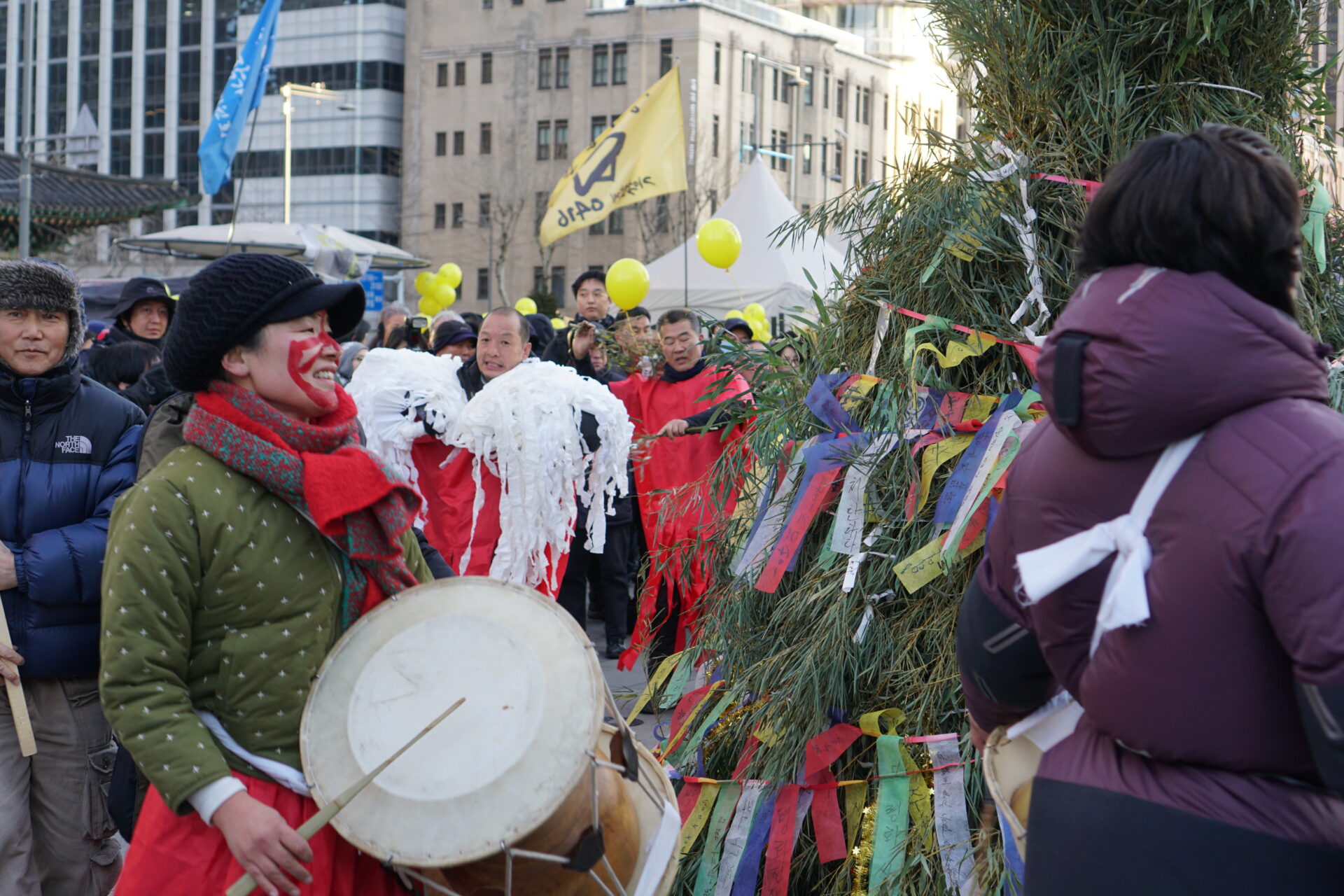 자신을 ‘풍물예술노동자’로 소개한 하애정 씨도 현재 광화문 캠핑촌 중 하나인 ‘퇴진 캠핑’ 텐트에 입주해있다. 하씨는 매주 토요일 광장에서 다른 풍물예술인들과 함께 풍물을 치고 있다. 이유를 묻자 “사람들의 답답한 마음을 풀어주기 위해서”라는 답이 돌아왔다. 그는 “대통령 탄핵뿐 아니라 정경유착 등 우리 사회 뿌리 깊은 문제를 해결하기 위해선 긴 시간이 필요”하고 “지칠 수 있는 긴 싸움에 풍물로 힘을 불어넣고 싶다”라고 설명했다. 주요한 사안이 새로 떠오르거나 절기가 바뀌면 퍼포먼스의 내용과 형식은 달라지곤 한다. 하 씨는 2월 11일 열린 집회에서 대보름을 맞아 민족미술인협회 화가들과 협업해 대보름 퍼포먼스를 벌였다. 화가들은 광장 가운데 대나무 달집을 세웠고 하 씨를 비롯한 풍물예술인들은 도깨비로 분장한 후 달집 주위를 돌며 풍물을 쳤다. 주위에 있던 시민들도 풍물에 맞춰 함께 몸을 흔들었다. 하 씨는 얼굴에 검은 칠을 하고 고깔을 쓴 채 “인간의 소원을 들어주는 도깨비가 돼 사회의 액을 다 날려 버릴 것”이라며 웃었다.