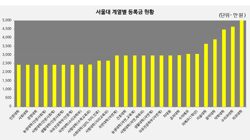 서울대학교 미술대학에 재학 중인 박모 씨(가상)는 지난 2017년 2학기 등록금으로 365만3천원을 냈다. 인문대학, 사회과학대학 학부생의 등록금인 244만2천원의 1.5배에 달하는 비용이다. 박모 씨는 120만 원가량의 등록금이 왜 추가됐으며 추가분은 어디에 쓰이는지 본부 예산과에 문의했다. 이후 그는 미대생이 1인당 사용하는 공간이 타과생보다 넓기 때문이라는 이유 외에 어떠한 설명도 들을 수 없었다.