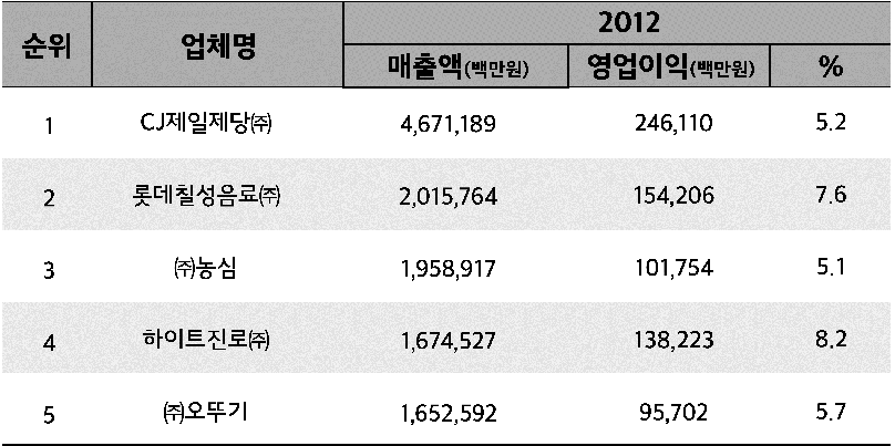2012년 기준 한국 식품산업 기업순위 ©한국식품산업협회