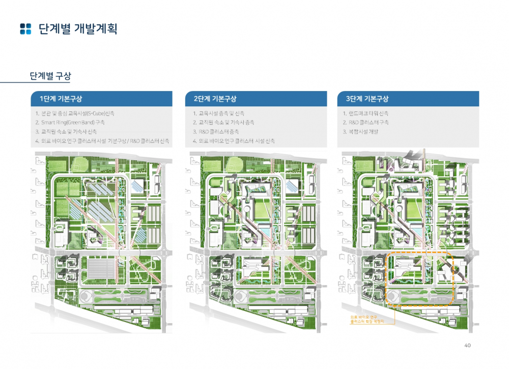 3단계까지의 예산뿐 아니라 계획 또한 불투명하다. 마스터플랜에 따르면 2단계와 3단계에는 각각 교육시설·연구동·의료 바이오 연구 클러스터와 랜드마크 타워·R&D 클러스터를 지을 예정이지만 구체적으로 어떤 프로그램이 운영되는지는 모호하다. 오헌석 부본부장은 현재 “2단계 계획을 새롭게 수립해서 그 계획을 바탕으로 재원 확충 방안까지 만들어야 하는 상황”이라고 설명했다. 1단계까지의 개발이 무사히 이뤄져도 이후의 예산과 계획 모두 새롭게 수립해야 하는 것이다.
