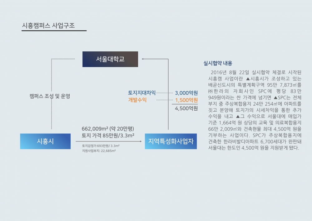 시흥시는 시흥캠 사업을 통해 단기적인 투기 수익 외에도 지속적인 소득을 창출할 수 있다. 2014년 1월 28일 나온 제1차 시민협의회 설명자료에서 시흥시는 서울대 유치 시 연간 5,651억 원의 소득 창출 효과가 기대된다고 설명했다. 시흥캠 유치를 홍보하는 자리에서 나온 주장으로 과장된 수치일 수 있지만 시흥캠 사업이 시흥시의 일방적인 희생으로 진행되는 것은 아니라는 의미다. ㈜한라 또한 흥국증권의 분석에 따르면 배곧신도시에서의 도급금액이 1.2조 원에 이르고, SPC 설립 이후 미래 수익성을 보여주는 지표인 PBR(주가순자산비율)이 0.35에서 0.5까지 상승하며 주가가 약 40% 뛰는 등 시흥캠 사업에서 많은 이득을 보고 있다.