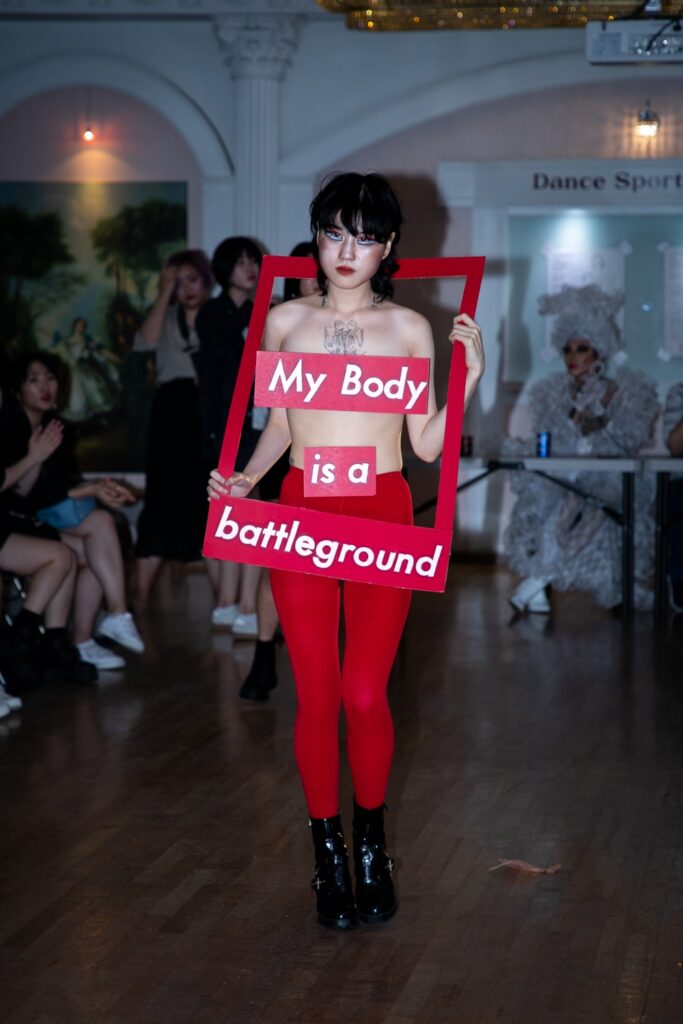 바디 포지티브는 주최 측의 고민이 잘 묻어난 카테고리였다. 여러 측면에서 스스로의 신체를 부정하던 성소수자들이 있는 그대로의 몸을 인정하는 기회로서 마련됐다. 참가자들은 카테고리에서 자신의 몸을 다양한 방식으로 긍정했다. 셔츠를 풀어 배 위에 휘갈겨 쓴 “I Am the Beauty”라는 문장을 보여주며 워킹한 우승자와 같이 평소 드러내기 어려웠던 신체의 일부를 거리낌 없이 드러낸 참가자들이 많았다. 다른 참가자였던 시몬(예명) 씨는 바바라 크루거의 작품 ‘Your body is a battleground’를 재해석해 ‘My Body is a battleground’로 표현한 의상을 선보이기도 했다.