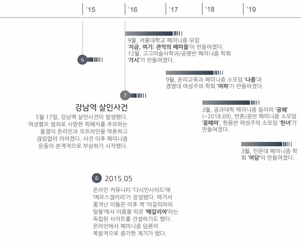 달은 강남역 살인사건 직후 학내에서 오픈세미나를 열어 여성억압이라는 구조에 대해 토론했고, 몇 달 후엔 인권주간 행사를 계기로 관악의 페미들이 결성됐다. 여성주의의 불모지로 여겨졌던 경영대와 공대에도 각각 2017년과 2018년에 경영대 여성주의 학회 ‘여파’와 공과대학 페미니즘 동아리 ‘공해’가 만들어졌다. 공명반 페미니즘 학회 ‘가시’, 언론/꼼반 페미니즘 소모임 ‘꼼페미’, 윤리교육과 페미니즘 소모임 ‘나름’, 인문대 페미니즘 학회 ‘여담’, 한음반 여성주의 소모임 ‘한녀’도 2017년부터 2019년 사이에 생겨난 페미니즘 단체 중 하나다. 이들처럼 포스터를 붙이거나 온라인으로 홍보하지 않는 작은 모임들까지 고려하면 여성주의 단체가 그야말로 우후죽순 생겨난 것이다.