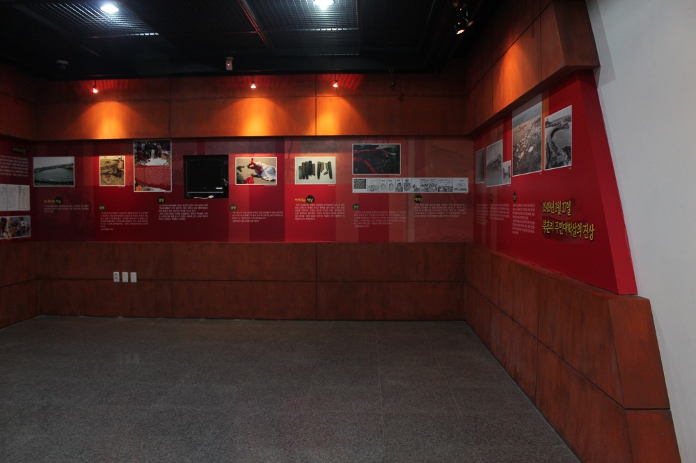 ▲벽 한 켠엔 북촌리 주민대학살 연대기가 기록돼있다. 1949년 1월 17일 일어난 대학살부터 주민들의 슬픔과 묵념조차 집단행동으로 낙인찍혀 금지된 향후 상황까지 기술돼있다.
