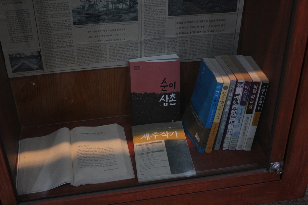 ▲제주 4·3사건을 근간으로 한 소설들이 진열돼있다.