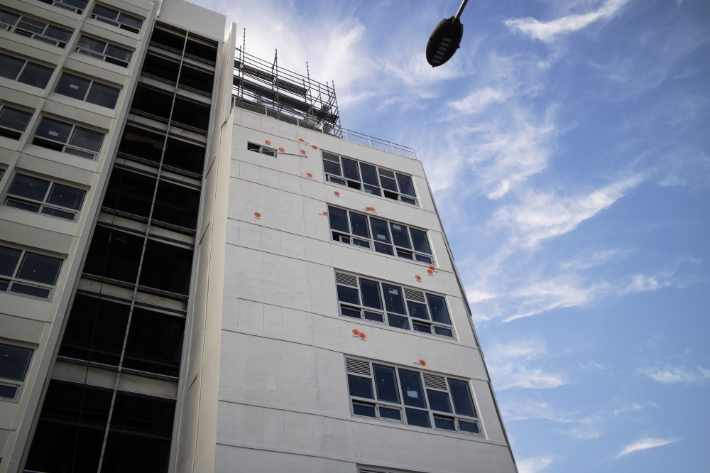 ▲전일빌딩은 구 전남도청의 건너편에 자리하고 있다. 광주일보의 전신인 전남일보가 한때 사용했던 전일빌딩은 민주 항쟁의 상처를 온몸으로 안고 있다. 당시 중앙정보부장이었던 전두환 씨는 헬기 사격의 존재를 부정했으나 빌딩 외벽에는 헬기 사격의 탄흔들이 남아있다. 사진 속 빌딩 외벽의 붉은 스티커는 탄흔을 표시해둔 것.