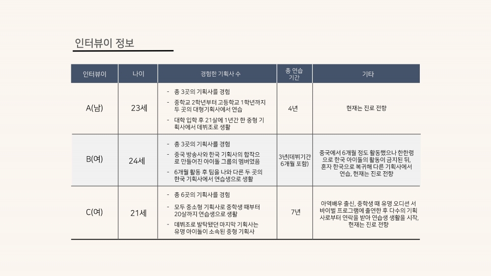 한국 연예기획사는 아이돌 육성의 전 과정을 주도한다. 이 를 통해 효율적이고 경쟁력 있는 문화 컨텐츠가 제작되지만, 기획사와 아이돌의 종속 관계는 각종 인권 침해와 불공정 계약의 원인이 됐다. 본격적인 연습생 생활이 시작되면 보통 기획사는 연습생에게 연습생 계약을 제시한다. 그런데 해당 계약의 내용과 형식은 공정성을 현저히 잃지 않는 한 제도적 제약이 없어, 기획사마다 체결하는 연습생 계약의 형태와 내용이 모두 다르다. 본지와 인터뷰한 A씨와 B씨 역시 다수의 기획사에서 계약 기간이나 회사의 의무를 상세히 기술하지 않은 무의미한 연습생 계약을 경험했다. 투자 금액의 2~3배에 달하는 과도한 위약금 조항이나 연습생 계약 종료 후 반드시 동일한 기획사와의 계약을 진행한다는 조항 등 불공정약관을 담은 연습생 계약은 더욱 악질적이다. 2017년 공정거래위원회 가 SM·YG·JYP를 비롯한 8개 대형 기획사 연습생 계약서의 불공정약관을 다수 바로잡았으나, 인터뷰를 통해 중소형 및 신생 기획사의 연습생 계약 횡포는 여전함을 알 수 있었다.