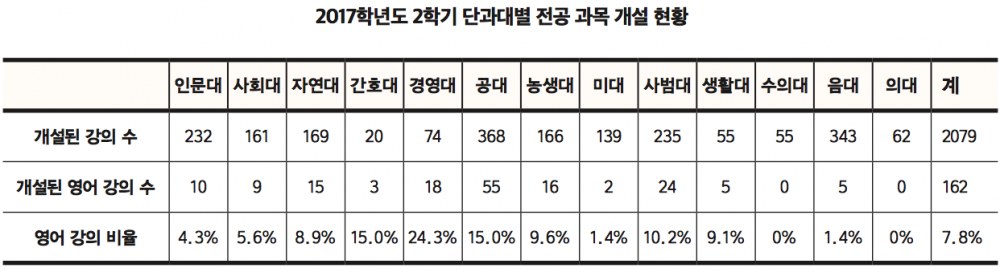 외국인 학생들은 영어 강의가 제한적으로 개설돼 수업을 선택하는 데 어려움을 겪는다고 토로한다. 2017학년도 2학기 학부과정에 개설된 강의 3,497개 중 영어 강의는 343개로, 약 9.8%를 차지한다. 특히 전공 과목의 경우 영어 강의는 2,234개 중 171개(약 7.5%)로, 일부 학과에는 영어 강의가 아예 개설돼있지 않기도 하다. 제랄딘 팔라시오스(Geraldine Palacios, 물리 14) 씨는 “한국어로 진행되는 강좌를 듣는 일은 힘들다. 기본적인 단어부터 외워야 하고, 전날 미리 수업 내용을 번역해와야 조금이나마 강의를 이해할 수 있다”고 말했다. 그는 강의 선택 시 우선적으로 영어 강의 여부를 고려한다며, “해양학을 복수전공하고 싶었지만 영어 강의가 없어 포기해야 했다”고 털어놨다.