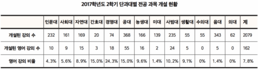 ▲2017학년도 2학기 단과대별 전공 과목 개설 현황