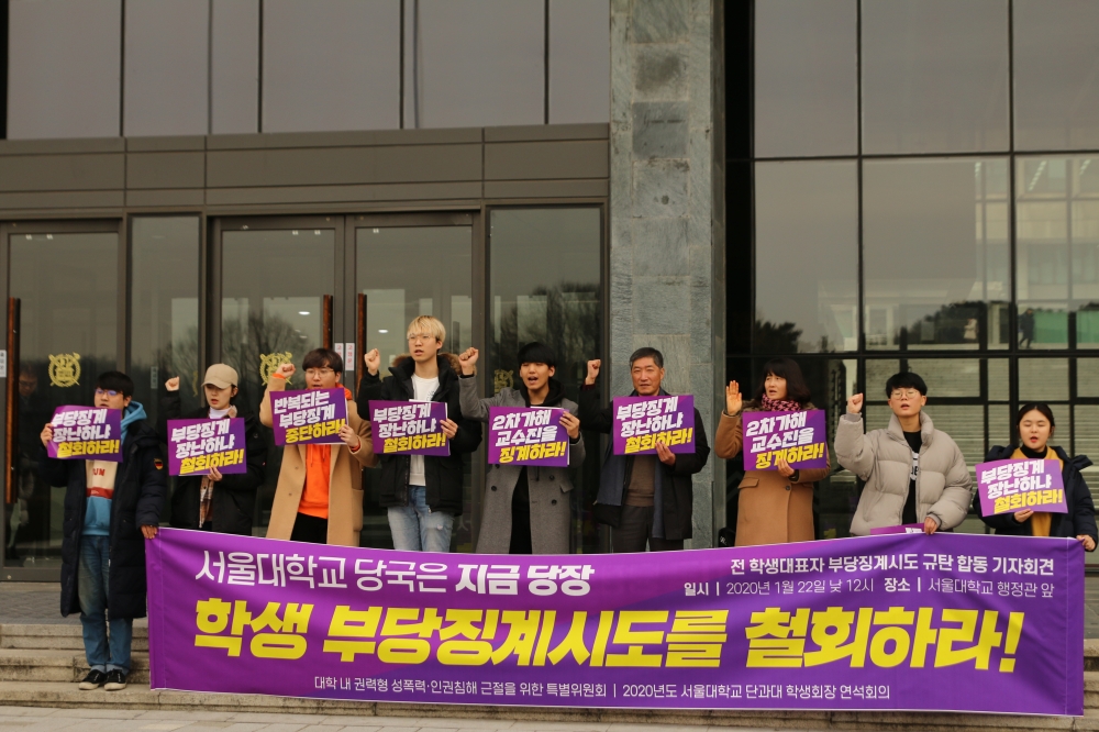 22일 낮 12시 ‘대학 내 권력형 성폭력·인권침해 근절을 위한 특별위원회'(근절특위)와 ‘2020 서울대학교 단과대학생회장연석회의'(연석회의), ‘서울대학교 민주동문회’는 공동으로 기자회견을 열고 인문대 이수빈 전 학생회장에 대한 징계 시도를 규탄했다.