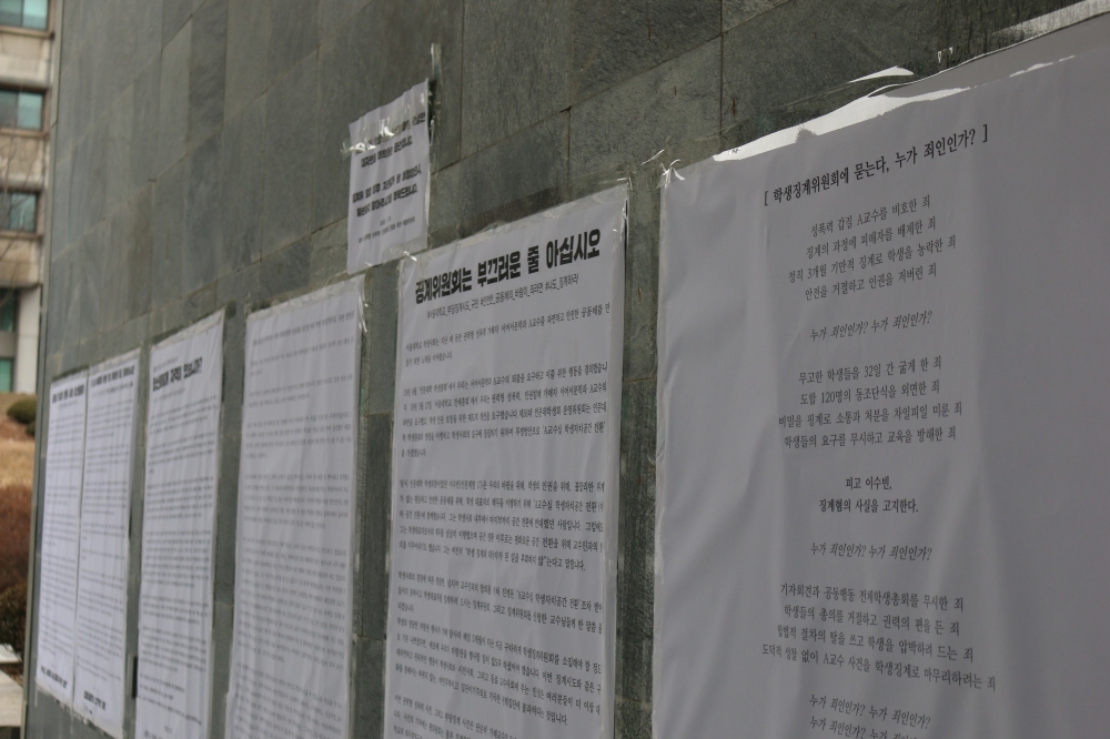 한편 인문대 학생회에서 16일에 발의한 ‘전 인문대 학생회장 징계위 회부 규탄 연서명’에는 22일 오전 10시 30분 기준 학부생 425명, 대학원생 25명, 학내 20여 개 단체가 연서명했으며, 행정관 1층에는 부당 징계 시도를 규탄하는 학생들의 대자보가 게시됐다.