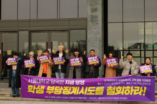 한편 인문대 학생회에서 16일에 발의한 ‘전 인문대 학생회장 징계위 회부 규탄 연서명’에는 22일 오전 10시 30분 기준 학부생 425명, 대학원생 25명, 학내 20여 개 단체가 연서명했으며, 행정관 1층에는 부당 징계 시도를 규탄하는 학생들의 대자보가 게시됐다.