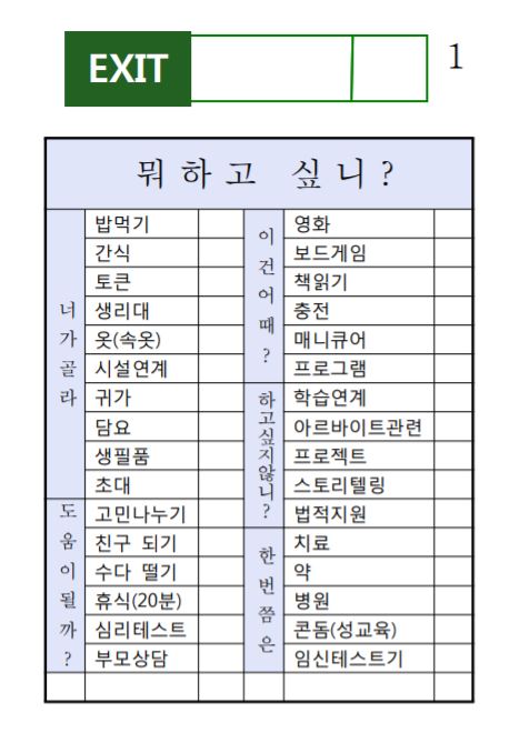 이윤경 활동가는 거리청소년에게 필요한 것을 예단하지 않고 ‘청소년이 중심이다’라는 슬로건을 실천해야 한다고 말했다. 엑시트는 거리청소년이 방문하면 필요에 맞는 도움을 제공하기 위해 ‘메뉴판’이라고 불리는 종이에 원하는 내용을 체크하도록 한다. 메뉴판은 가벼운 상담 요청부터 청소년으로선 쉽게 언급하기 힘들 수 있는 성 관련 용품까지 포괄하고 있어 청소년들이 가능한 부담 없이 도움을 요청하도록 한다.