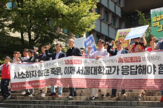 참가자들은 학교가 사건이 발생한 청소 노동자 휴게공간에 대해서만 개선의 움직임을 보이고 있다며 열악한 노동환경에 처해있는 다른 학내 노동자들의 문제에도 관심을 기울여야 한다고 입을 모았다. 민주노총 전국대학노조 서울대지부 이창수 부지부장은 “생협 식당 노동자들 또한 3평도 되지 않고 선풍기 한 대가 냉방기의 전부인 협소한 휴게실에서 쉬고 있다”며 노동현장의 실태를 고발했다. 도정근(물리천문 15) 총학생회장은 “서울대 구성원의 일상은 고인과 같은 노동자분들에 의해 지탱됐지만 학교 당국은 고인의 지병에 의한 것이었다고 말하며 책임을 회피하고 있다”며 본부는 보여주기식 대응이 아닌 실질적 대책을 마련해야 지적했다.