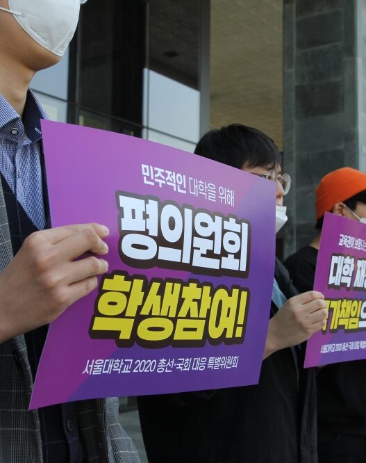 19일 오전 민주노총 전국대학노동조합 서울대지부(대학노조)와 비정규직 없는 서울대 만들기 공동행동(비서공)은 행정관(60동) 앞에서 집회를 열고, 생협 노동자들의 노동조건 개선을 요구했다. 노조 측은 “현재 생협 노동자들의 1호봉 기본급은 최저임금 수준에도 못미치는 171만 5천 원에 불과하며 세금을 제외하고 실제로 받는 금액은 150만 원 정도”라며 “노동강도 역시 매우 높아 인력 충원조차 힘든 실정”이라고 밝혔다. ‘비정규직 없는 서울대 공동행동’ 측은 이날 성명문을 통해 학생회관 식당에서는 서른 명의 노동자가 하루 6천 명분의 식사를 준비하고 있으며, 이들은 땀띠나 관절 통증 등의 질환에 항상 시달리고 있다고 밝혔다.