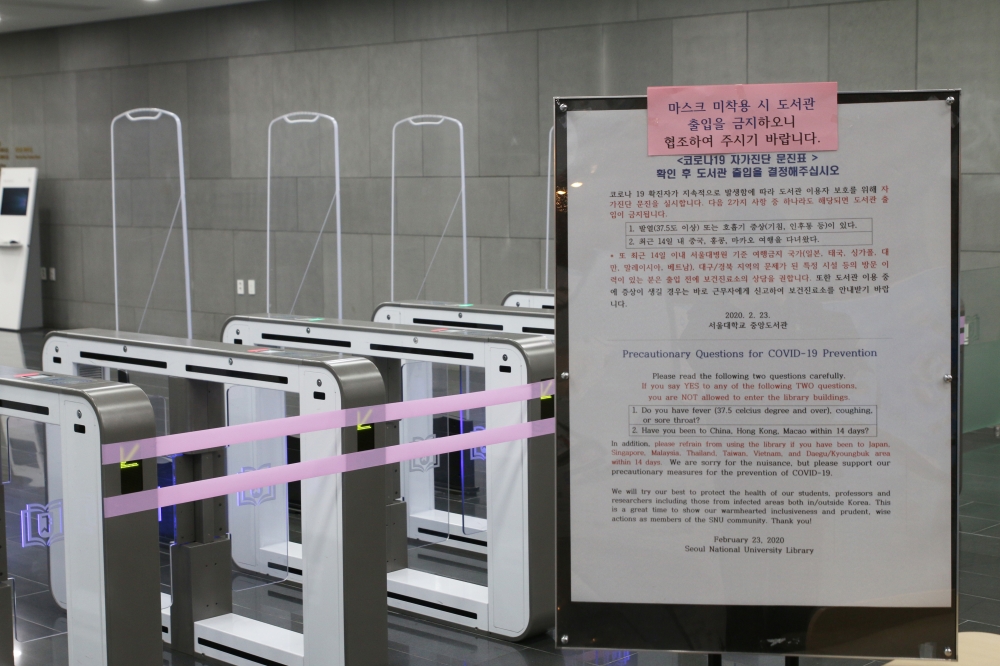 개강을 앞두고 전국의 대학들에도 비상등이 켜졌다. 전국 4년제 대학 91%가 개강을 1~3주 가량 연기했으며 교육부는 입국 예정인 중국 유학생을 대상으로 3단계에 걸친 보호·관리 방안을 실시한다고 밝혔다. 위험 수준이 격상됨에 따라 대학들은 대처 방안을 준비 중이다. 서울대학교는 중앙도서관 본관과 관정관의 출입을 통제하는 한편, 코로나19 예진실을 운영한다. 교육부가 재택수업을 권고함에 따라 서울대학교는 3월까지 대면 강의를 진행하지 않으며 사태의 추이에 따라 기한은 연장될 수 있다고 밝힌 바 있다.