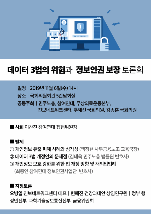 데이터3법은 이런 상황 속에서 개정된 것이다. 백정현 교육국장은 “정보 인권은 지금까지도 국가 공백의 영역이었지만, 거기서 한 걸음 더 나아가 그나마 존재하던 개인정보 보호 수준까지 상실한 것이 이번 개정”이라 강조했다. 국민의 개인정보와 사생활 기본권을 수호할 최후의 의무를 지닌 주체는 이를 헌법으로 명시한 국가다. 정부가 앞장서 개인정보‘보호’법의 초점을 ‘활용’으로 변화시킨 사실이 뼈아픈 이유다.